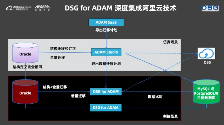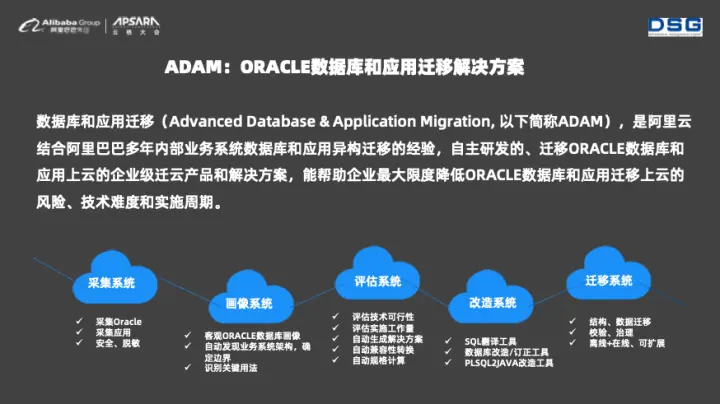 DSG和ADAM的核心能力结合起来就能够形成Oracle迁移智能全链路解决方案,并且在国内的很多客户企业中已经落地。这么多年来,DSG一直在深耕数据迁移方面的底层技术。而且DSG for ADAM深度集成了阿里云的技术,实现了数据迁移、数据比对等过程的可视化。此外,DSG for ADAM数据库迁移方案对于正常业务的干扰极小,并且可以在中间状态、云上云下环境中部署。为了打消客户对于数据库迁移的疑虑,DSG还提供了完善的数据回流功能。
