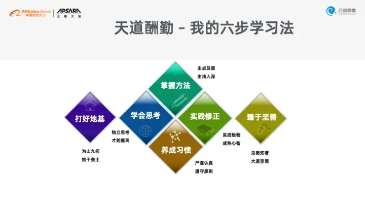 无论对于程序员还是DBA而言,学习方法可以分为6步。第一点就是打好地基,“为山九仞,始于垒土”,学习任何技术将基础打牢都是前提,这样才能灵活运用这些技术解决现实中遇到的困难。第二点是学会思考,很多人虽然学习了很多知识,但是没有独立思考的意识,在学习过程中一定要学会自己设问、自己解答,这样的历程可以促进自己成长。第三点是掌握方法,总有一种方法可以帮助你加快学习速度,其中最经济的方法就是“由点及面,由浅入深”,抓住遇到的任何一个问题,深究到源码层,这样由知识点到线再到面连在一起。第四点是养成习惯,对于DBA而言,严谨是非常重要的,任何一个疏忽都可能导致灾难。第五点是实践修正,最有助于个人成长的是高压环境,通过实践来验证知识体系。最后一点就是臻于至善,走过千山万水,最后得以“见微知著,大道至简”,可以轻而易举地解决困扰别人已久的问题。