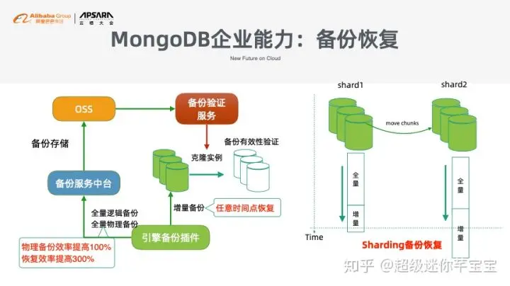 MongoDB作为企业级数据库需要关注四个方面,即安全审计、备份恢复、数据同步以及弹性伸缩。MongoDB的安全审计与Redis基本一致,进一步增加了TDE加密。MongoDB增加了物理备份,使得备份和恢复效率都有了大幅度提升,并且通过增量备份能力使得数据能够恢复到任意时间点。此外,在备份的基础之上,阿里云MongoDB还提供了备份验证能力。