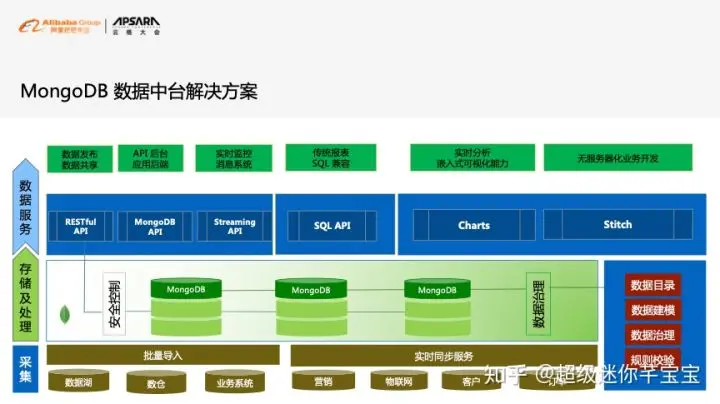 如下图所示的是较为完整的MongoDB数据中台解决方案参考架构,从下到上依次是采集、存储处理以及数据服务三层。