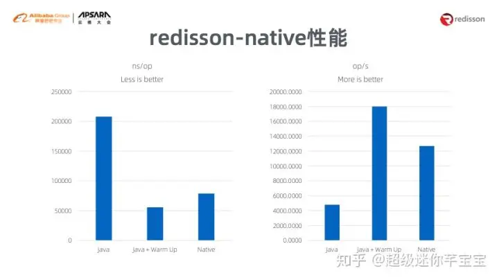 于是,Redisson开始了“逃跑之路”,实现了redisson-native。对于Java、Java+Warm UP以及Native三种方式的性能进行对比,能够看出redisson-native的性能具有明显的优势。
