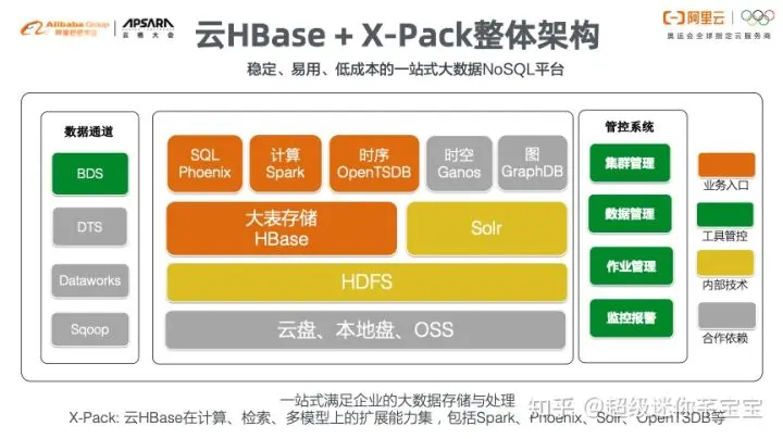 阿里巴巴从2010年开始调研HBase,如今已经走过了近十个年头。随着这十年的逐步探索,阿里巴巴也丰富了HBase的使用场景,如消息,订单,Feed流,监控,大屏,轨迹,设备状态,AI存储,推荐,搜索,BI报表等。阿里巴巴自己使用HBase已经达到了非常大的体量和规模,也在产品上有了很多积累和沉淀,形成了如今云HBase+X-Pack的架构。单独依靠HBase数据库无法解决业务场景下的复杂问题,因此X-Pack基于云HBase在计算、检索、多模型上进行了扩展,包含了Spark、Phoenix、Solr以及OpenTSDB等,形成了稳定、易用、低成本的一站式大数据NoSQL平台。