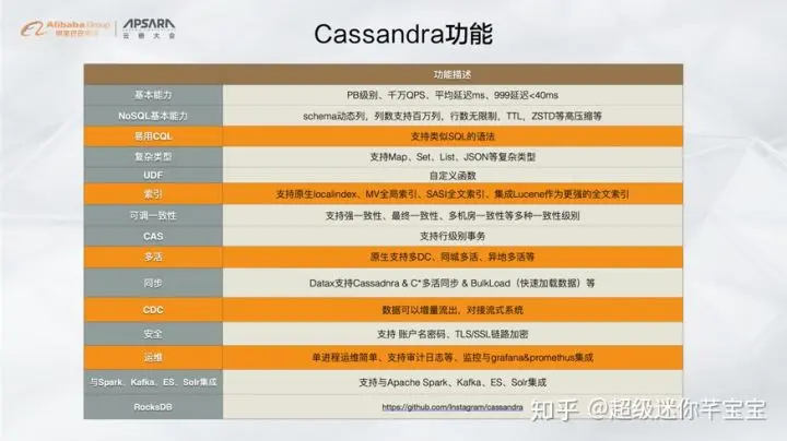 Cassandra具有很多功能,比较特别的就是其索引支持物化视图、还支持SASI全文索引,并且集成了Lucene做更强的全文索引,以及支持CDC对接流式系统。