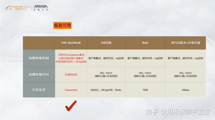 为什么选择Cassandra呢?Cassandra是一种完全没有中心的数据库,其每个节点都是主节点,如果Kill掉其中任何一个节点都不会影响集群的QPS以及延时。除了Cassandra使用的P2P-QUORUM机制之外,还有HA机制、Raft以及单内存副本+共享存储等机制,而只有Cassandra能够做到几乎没有感知时间,因此Cassandra的Slogan就是“Always Online”。