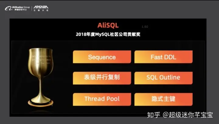 对于阿里而言,AliSQL获得了2018年MySQL的社区公司贡献奖,这是因为AliSQL做了大量优化,比如实现了Sequence、表级并行复制以及隐式主键等。而做这些优化的驱动力是阿里内部的业务需求,并且对于技术的优化后续就会贡献回开源社区。