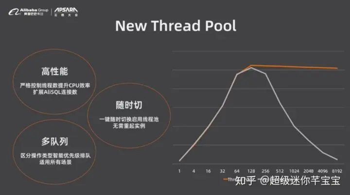 MySQL官方版本也有线程池,而AliSQL线程池的区别在于连接数可以达到2万,并且能保持非常平稳的输出。首先,AliSQL严格控制了线程数来提升了CPU效率,做到了高性能。其次,AliSQL可以一键随时切换启用线程池,而无需重启实例。最后,AliSQL能够区分操作类型并实现智能优先级排队,并适用于所有业务场景。总之,AliSQL的线程池是完全重新实现的,并且性能也会超出期望。