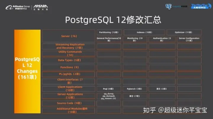 目前,PostgreSQL 12的开发速度非常快,今年5月份发布Beta 1版本,6月份发布Beta 2版本,8月份发布Beta 3版本,9月份发布Beta 4版本,并且有可能成为了最后一个Beta版本,这意味着PostgreSQL 12即将正式发布。虽然每个Beta版本对大家而言可能只是一个小版本,但对于PostgreSQL社区而言,却意味着大量修改,比如在PostgreSQL 12的Beta 3版本中修改了2个安全issue并且修改了40个小Bug。截止到目前,PostgreSQL 12的Beta版本总共做了161项修改,整体而言修改非常大,很多技术的修改和完善将为PostgreSQL带来很大的提升。而且在未来,PostgreSQL基本上每个季度都会推出一个小版本,每年发布一个大版本。