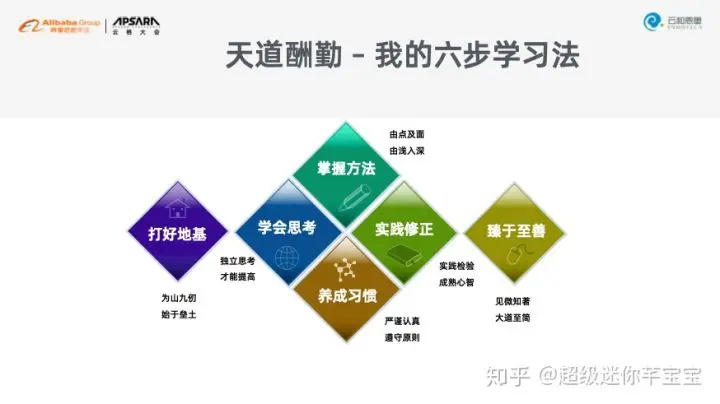 无论对于程序员还是DBA而言,学习方法可以分为6步。第一点就是打好地基,“为山九仞,始于垒土”,学习任何技术将基础打牢都是前提,这样才能灵活运用这些技术解决现实中遇到的困难。第二点是学会思考,很多人虽然学习了很多知识,但是没有独立思考的意识,在学习过程中一定要学会自己设问、自己解答,这样的历程可以促进自己成长。第三点是掌握方法,总有一种方法可以帮助你加快学习速度,其中最经济的方法就是“由点及面,由浅入深”,抓住遇到的任何一个问题,深究到源码层,这样由知识点到线再到面连在一起。第四点是养成习惯,对于DBA而言,严谨是非常重要的,任何一个疏忽都可能导致灾难。第五点是实践修正,最有助于个人成长的是高压环境,通过实践来验证知识体系。最后一点就是臻于至善,走过千山万水,最后得以“见微知著,大道至简”,可以轻而易举地解决困扰别人已久的问题。