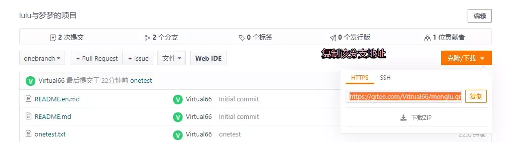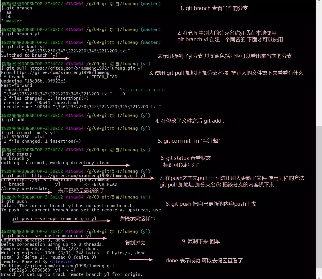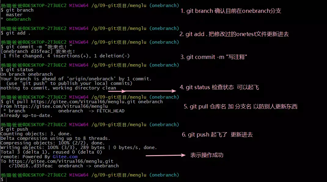 d)再pull一次防止别人更新了内容 pull+库地址+分支名