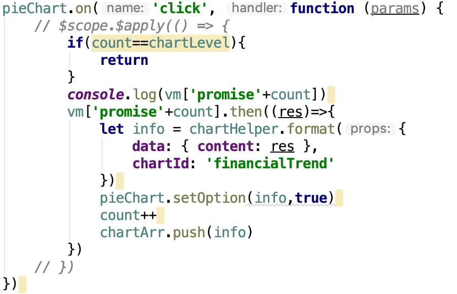 pieChart.on('click', function (params) { // $scope.$apply(() => { if(count==chartLevel){ return } console.log(vm['promise'+count]) vm['promise'+count].then((res)=>{ let info = chartHelper.format({ data: { content: res }, chartId: 'financialTrend' }) pieChart.setOption(info,true) count++ chartArr.push(info) }) // })})* vm是this,指向的angular的控制器;
