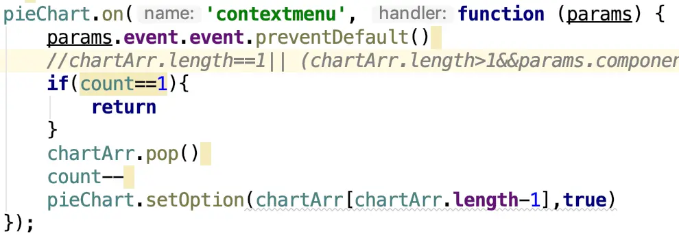 pieChart.on('contextmenu', function (params) { params.event.event.preventDefault() if(count==1){ return } chartArr.pop() count-- pieChart.setOption(chartArr[chartArr.length-1],true)});- 取消默认的右键菜单