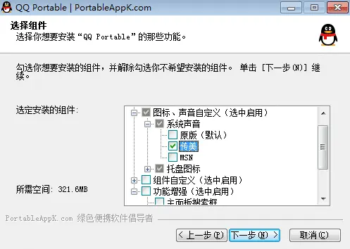 3、本便携版采用组件方式安装,包括图标、声音自定义、组件自定义、功能增强三类。你可以自由选择需要哪些功能,不需要哪些功能。你可以得到一个极度精简的 QQ,也可以得到一个功能增强的 QQ。