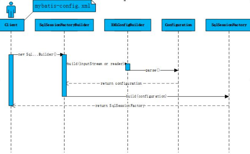 - 第一步首先SqlSessionFactoryBuilder去读取mybatis的配置文件,然后build一个DefaultSqlSessionFactory,即得到SqlSessionFactory