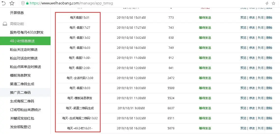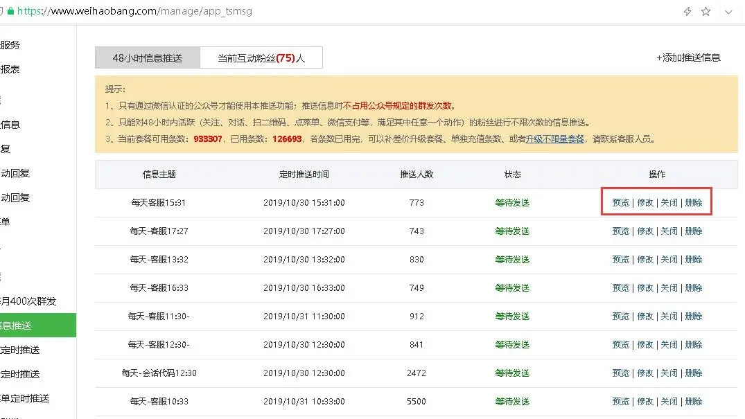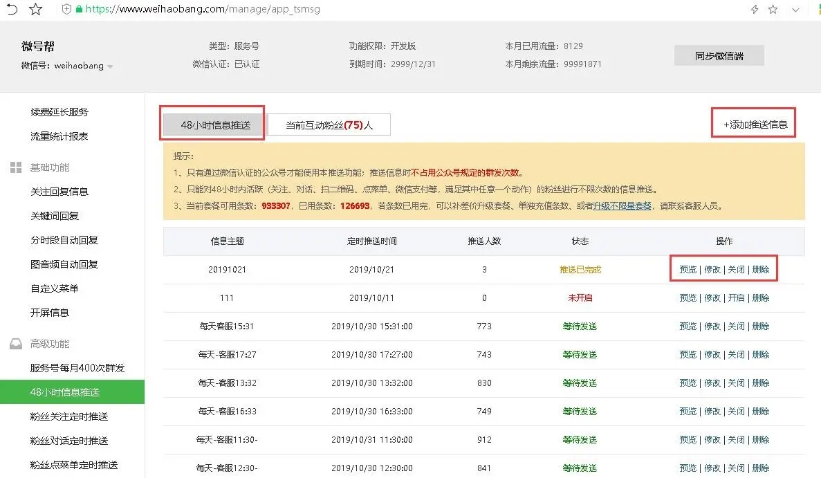 微号帮平台上添加好48小时信息推送,记得开启发送,随时可以预览发送效果和修改、关闭发送。
