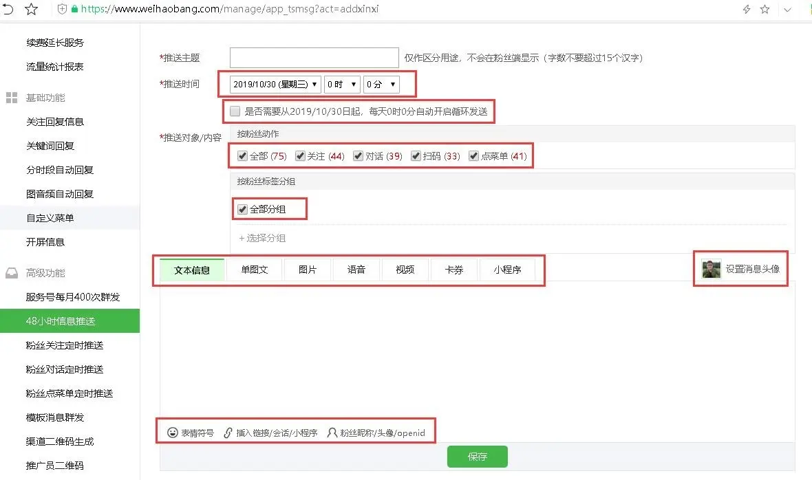可以设置消息未来30天定时群发,按粉丝互动活跃动作发送,也可以分组群发,支持每天循环重复发送,推送的头像昵称也可以修改。