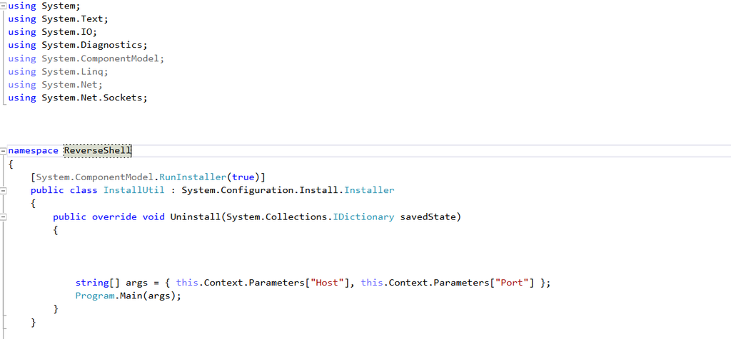 - 我们可以将 installutil 集成到无 powershell 的程序集中,并且我们可以用自己的行为对它的一些操作进行掩盖。例如:卸载过程 ==》 installutil /u <程序集>