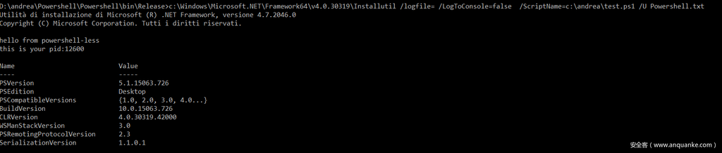 installutil /logfile= /LogToConsole=false /ScriptName=c:\andrea\test.ps1 /U Powershell.txt