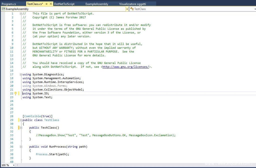 首先,下载整个 DotNetToJscript 项目,启动Visual Studio 2015,打开项目 “DotNetToJScript.sln”,然后切换到 TestClass.cs: