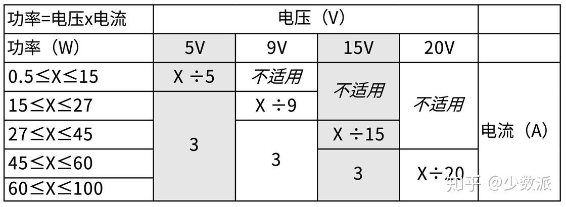 USB 本身有一个标准的供电协议,现在也被合并进入了 USB Power Delivery 中。USB Power Delivery 目前已经更新到了 3.0 协议了(下文简称 PD 3.0),PD 3.0 目前支持 5V、9V、15V 和 20V 四档电压,最大支持 100W 的功率输出,具体每个电压档位可以输出的功率和电流请看下图(需要注意 micro-B 只支持 PD 1.0 协议,最大输出 60 W 的功率):