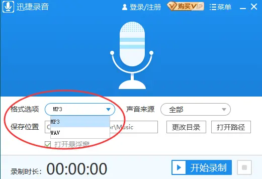 2、在我们点开这款软件的格式选项,会发现在这款软件中我们在录制电脑声音的时候有两种输出格式可以选择,选择好自己在录制电脑声音的时候需要的电脑声音格式,这也是我们要保存的声音格式。