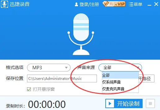 3、再点击这款电脑录音软件右侧的声音来源,同样可以发现这款软件的声音来源也有几种选项,比格式选项要多一种选项,这三种选项可以满足我们电脑录音的大部分需求。