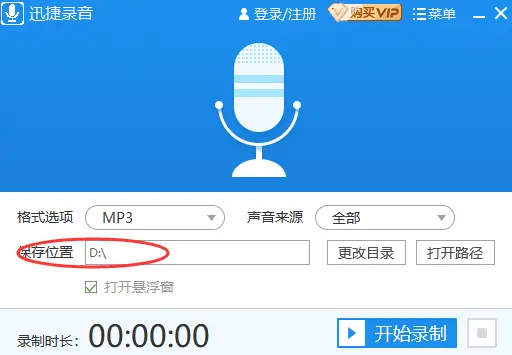 4、选择好格式后我们可以先设置录制结束后文件的放置地点,可以是软件自带的文件放置路径,也可以是自己选择的文件放置路径。自己选择声音保存路径的时候尽量选择在D盘中保存,防止找不到文件夹。