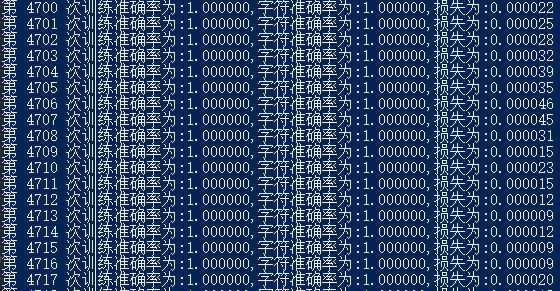 此外,对准确率计算函数进行了优化,除计算每个样本的准确率外,还计算了单个字符的准确率,以便更直观的观察训练过程。 单个字符的准确率可理解为将每个样本都拆分为4个字符,然后计算所有字符的当前训练准确率。