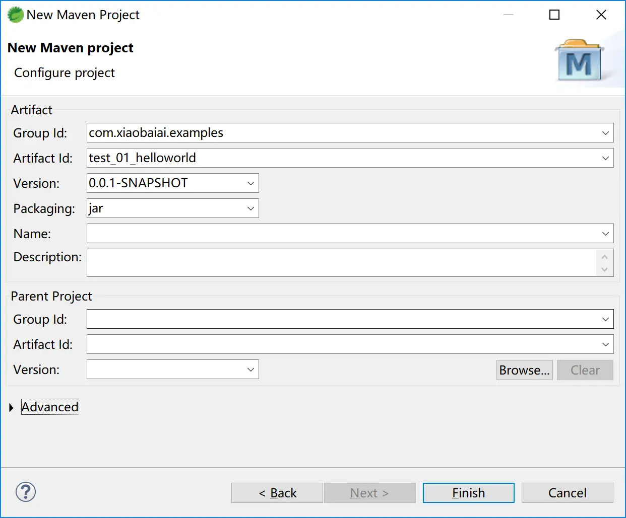 创建Marven项目中,我们选择Create a Simple Project,可以选择默认工作目录或者其他存放项目的目录,Next后需要我们填写一些项目信息,包括: