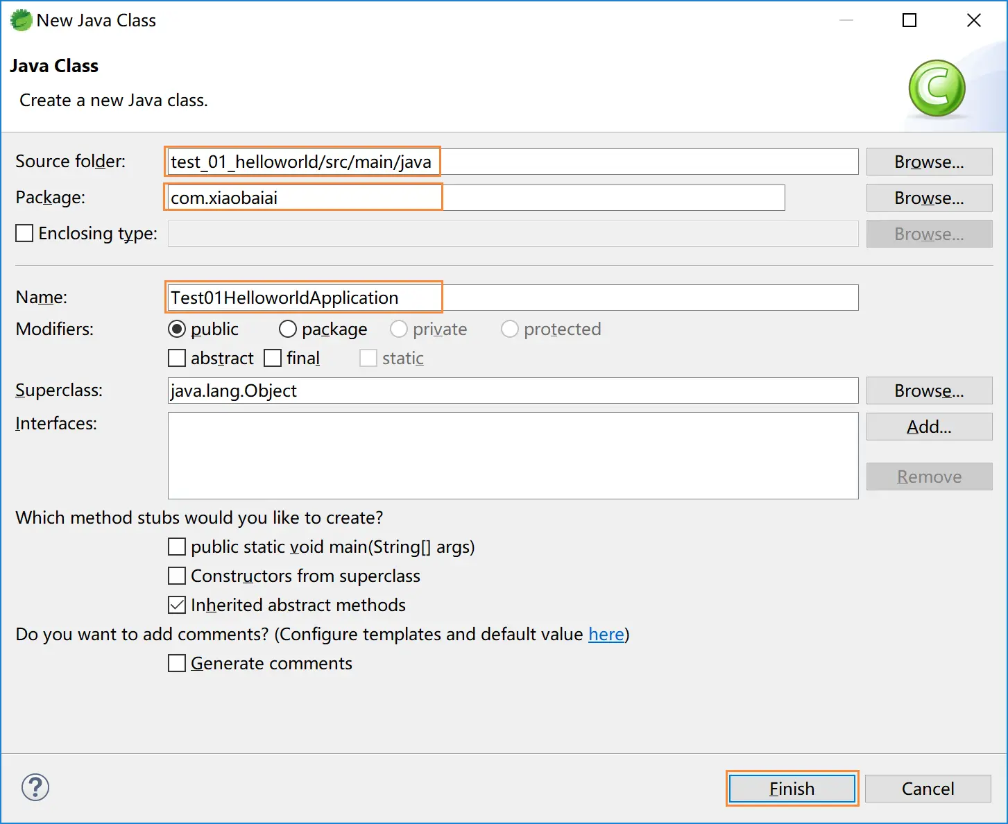 填写Package和Name,点击Finish,创建完成,然后编写该Java文件: