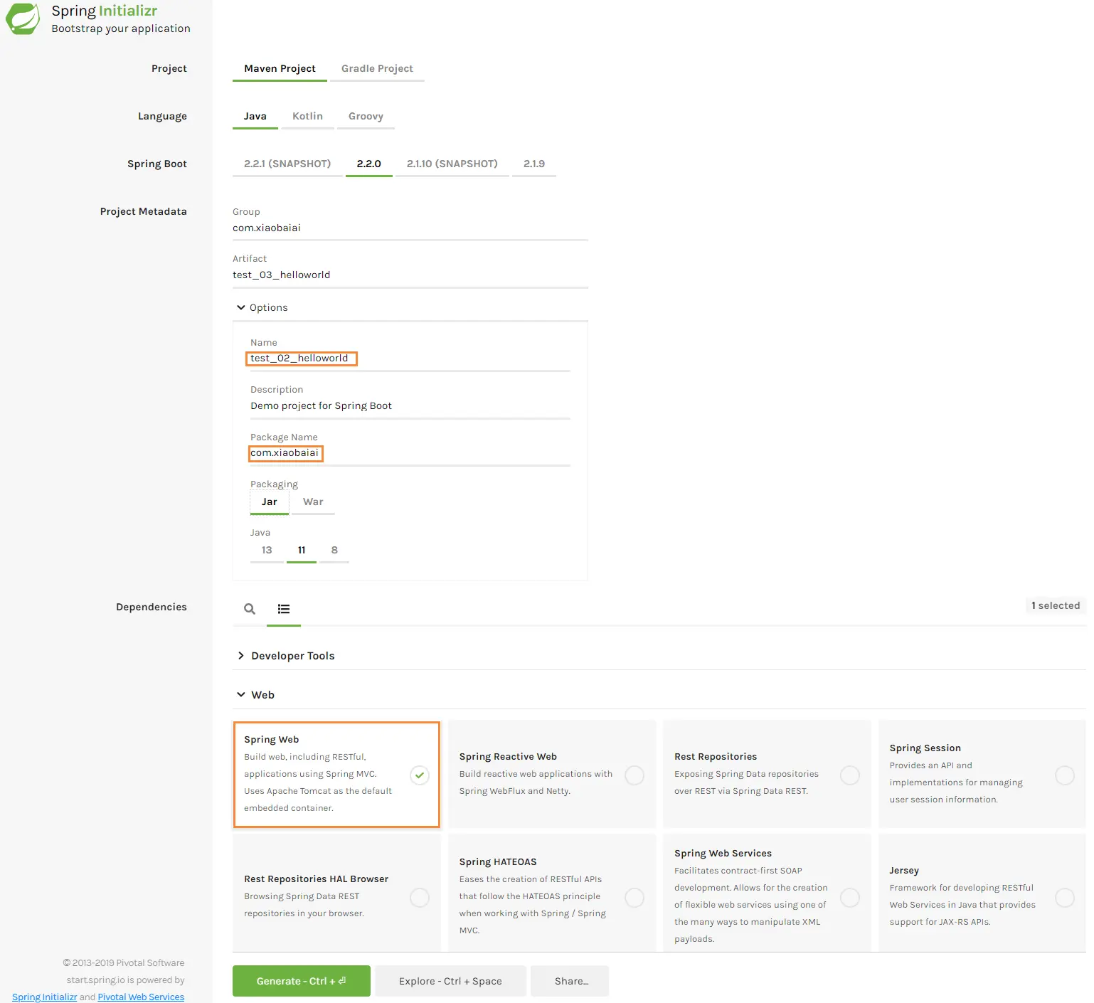 在浏览器中打开start.spring.io,输入项目相关信息,并选择Spring Boot及构建工具等,在Dependencies的Web栏中选中Spring Web,最后点击绿色按钮Generate - Ctrl按钮生成工程文件压缩包,放于你的工作目录中并解压,然后用STS导入该项目: