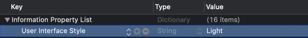 在info.plist里面加一个key:UIUserInterfaceStyle,把他的值设为Light或Dark