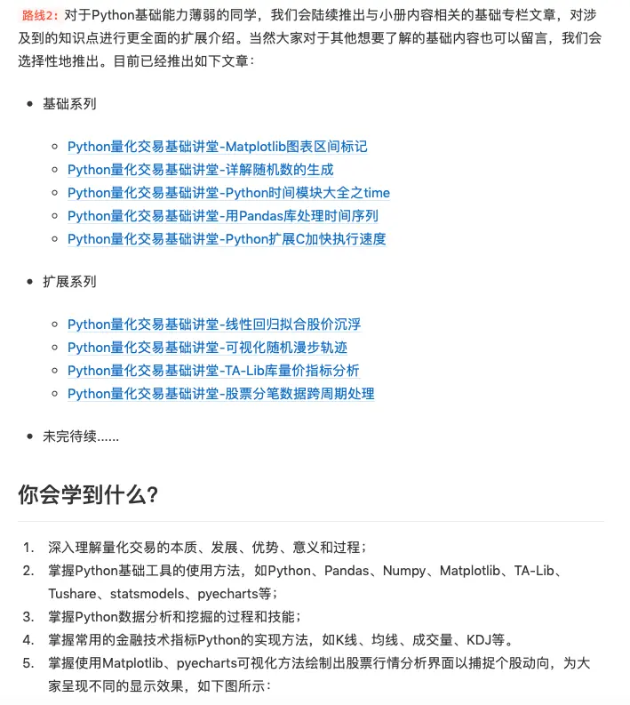 《Python实战-构建基于股票的量化交易系统》小册子主要侧重于 Python 实战讲解,但在内容设计上提供了前置基础章节帮助读者快速掌握基础工具的使用。同时我们会持续更新一些关于Python和量化相关扩展文章,帮助大家夯实基础和增值学习效果。目前已经推出如下文章: