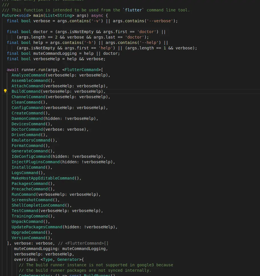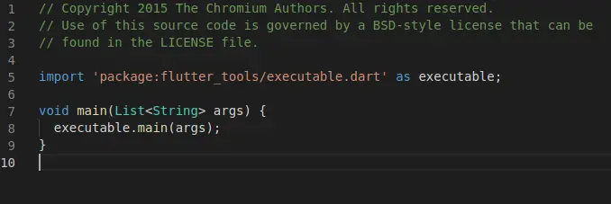 - 接下来查看一下flutter_tools.snapshot的源码文件,位于/your_flutter_sdk_path/flutter/package/flutter_tools/bin/flutter_tools.dart