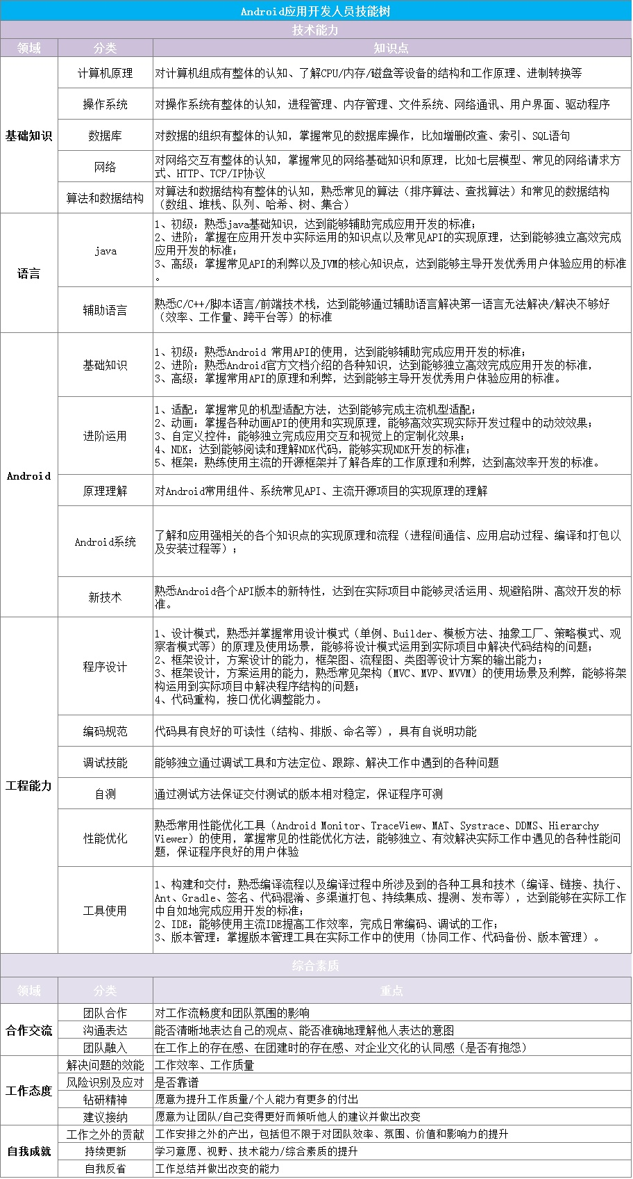 下面列出的Android应用开发人员的技能树仅为本人结合自身工作经验和感受的理解,无论对于一个团队还是个人,它不一定是标准,但具有一定的参考价值。