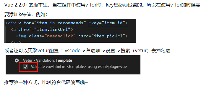 注意:vue中列表循环需加:key="唯一标识"唯一标识可以是item里面id,index等,因为vue组件高度复用增加Key可以标识组件的唯一性,为了更好地区别各个组件key的作用,主要是为了高效的更新虚拟DOM。