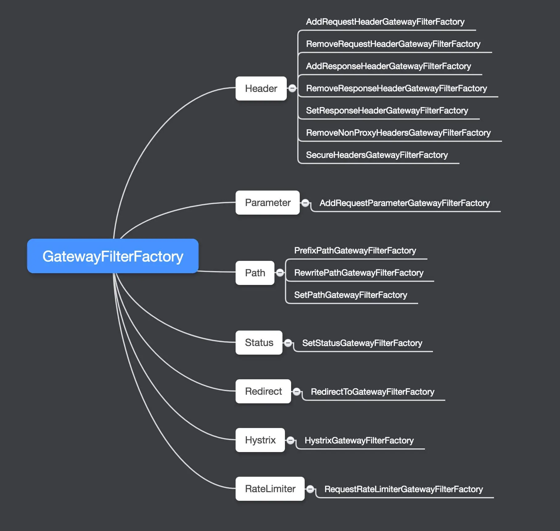 GatewayFilterFactory 实现类较多,根据用途整理如下脑图 :