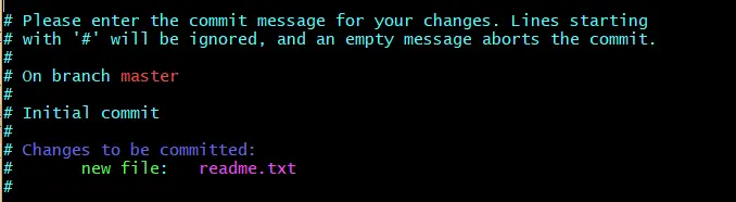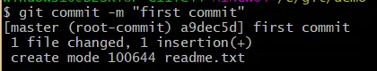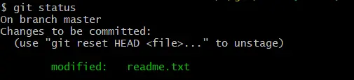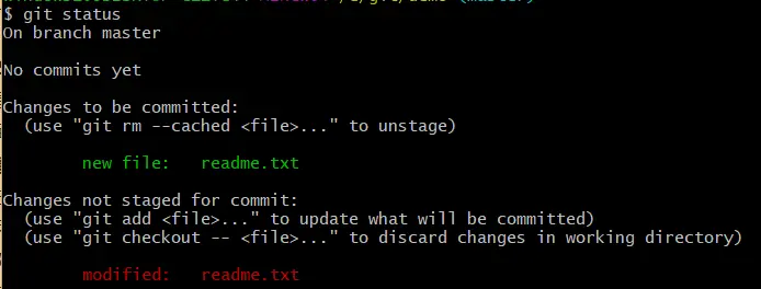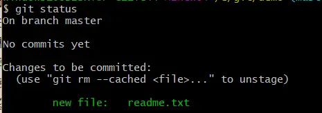 再次使用 git status 命令查看,会看到 readme.txt 文件已经被跟踪,并处于暂存状态。Changes to be committed 下的文件就是处于暂存状态