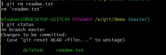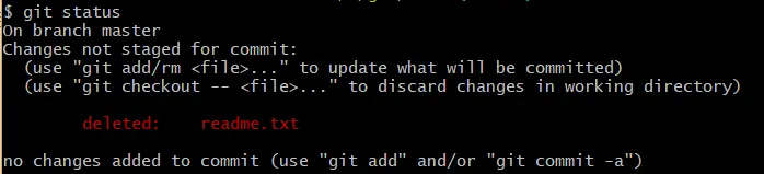 假如我们现在去删除 readme.txt 这个文件,再通过 git status 查看状态