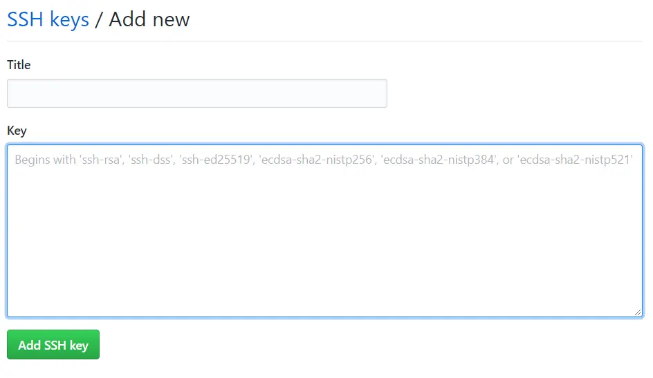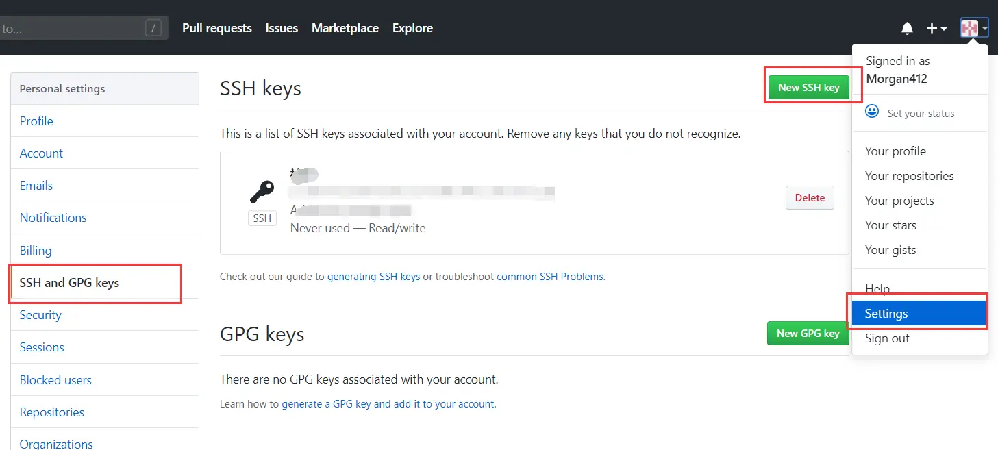 然后我们去到 github 的设置中心找到 SSH and GPG keys,点击 New SSH key 设置 SSH 公钥