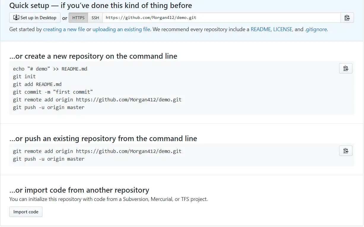 上面会有一些提示,允许我们创建一个新的本地仓库或把已存在的仓库推到 github仓库上,这里我们直接把直接的 demo 上传到这个 github 仓库中
