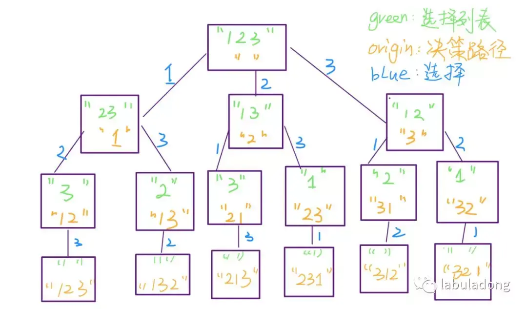 可以发现每向下走一层就是在「选择列表」中挑一个「选择」加入「决策路径」,然后把这个选择从「选择列表」中删除(以免之后重复选择);当一个决策分支探索完成后,我们就要向上回溯,要把该分支的「选择」从「决策列表」中取出,然后把这个「选择」重新加入「选择列表」(供其他的决策分支使用)。