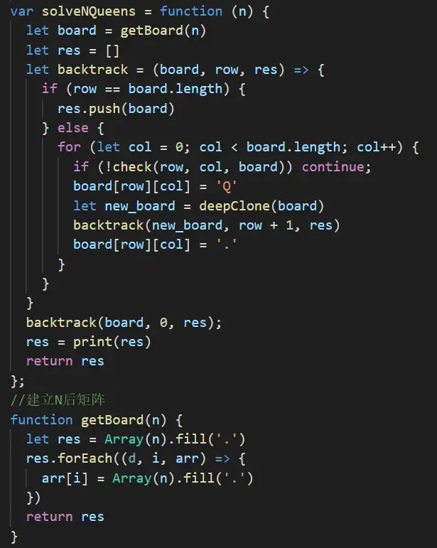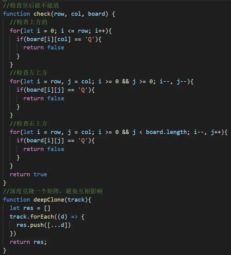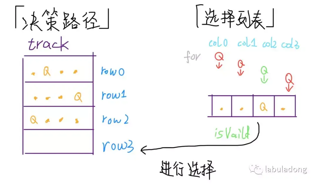 「选择列表」:对于给定的一行(即决策的每一步),每一列都可能放置一个 ‘Q’,这就是所有的选择。代码中的 for 循环就在穷举「选择列表」判断是否可以放置皇后。