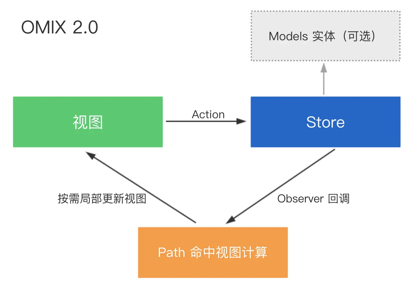 OMIX 2.0 是 westore 的进化版,westore 使用的是数据变更前后的 diff,diff 出的 json 就是 setData 的 patch,omix 2.0 使用的是 observer 监听数据的变更得到 setData 的 patch。 和 omix 对比,westore 运行时需要更多的计算,omix 初始化时需要更多的内存和计算,但是数据变更时 omix 速度比 westore 快,编程体验方面,omix 不需要手动 update,westore 需要手动 update。