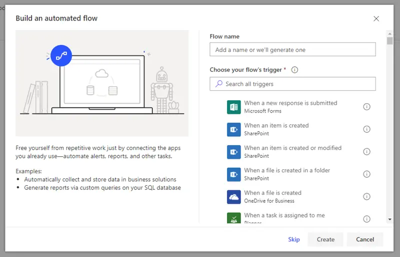 要开始使用,请导航至Flow,登录,转到“我的流程”,选择+新建,然后从下拉菜单的空白中选择+自动。您应该看到以下内容: