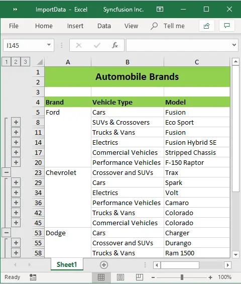 可以将来自Excel的数据导出到集合对象,以便可以将这些值用作模型。现在,XlsIO允许将数据导出到嵌套类,以可视化相对结构中的数据。