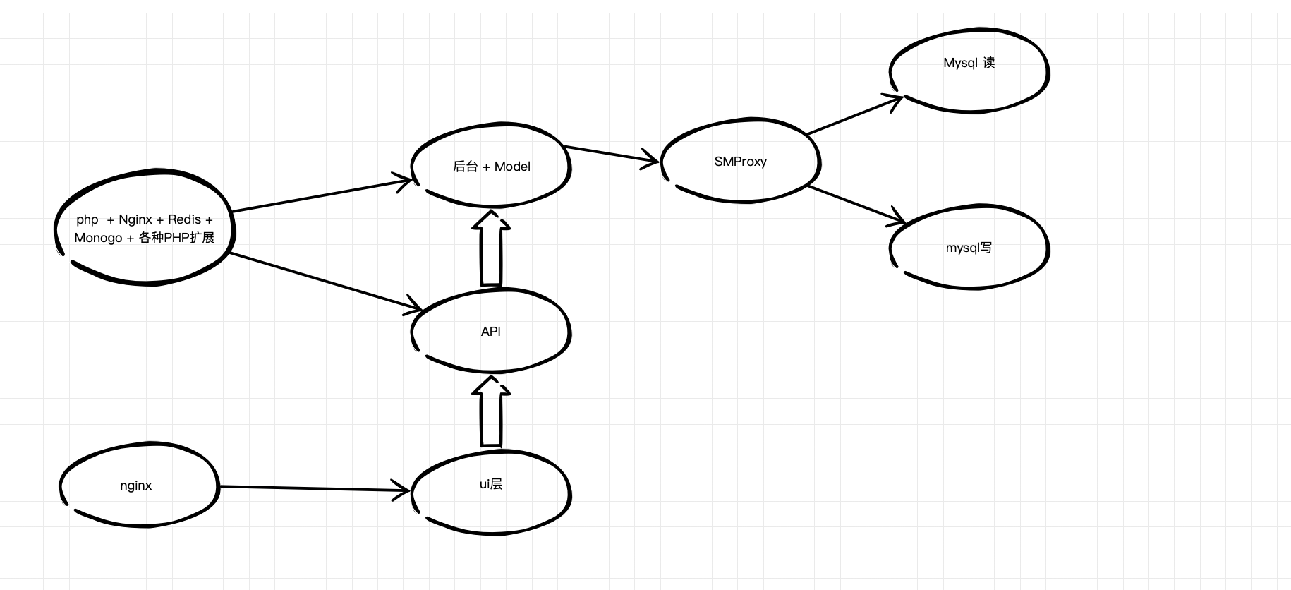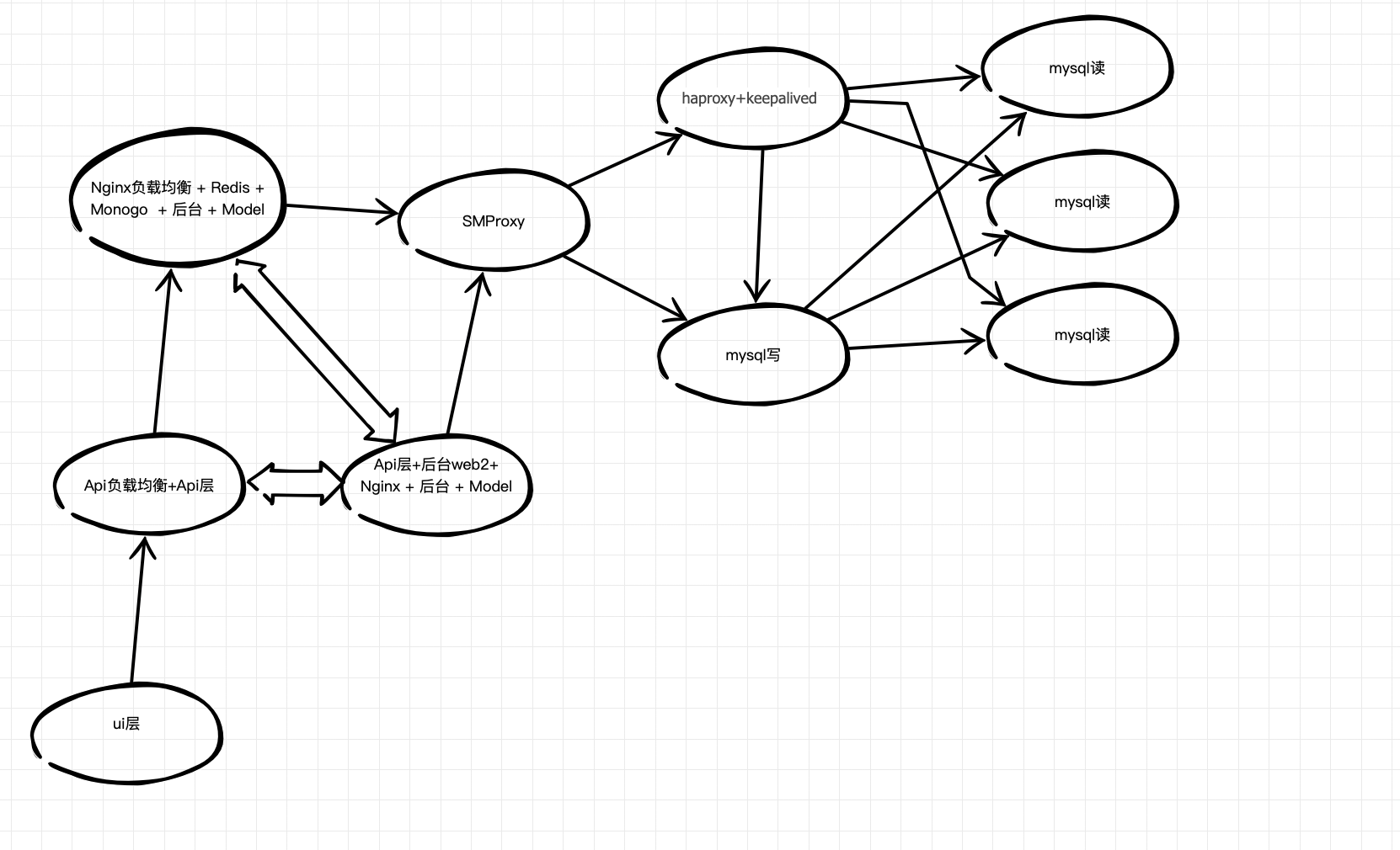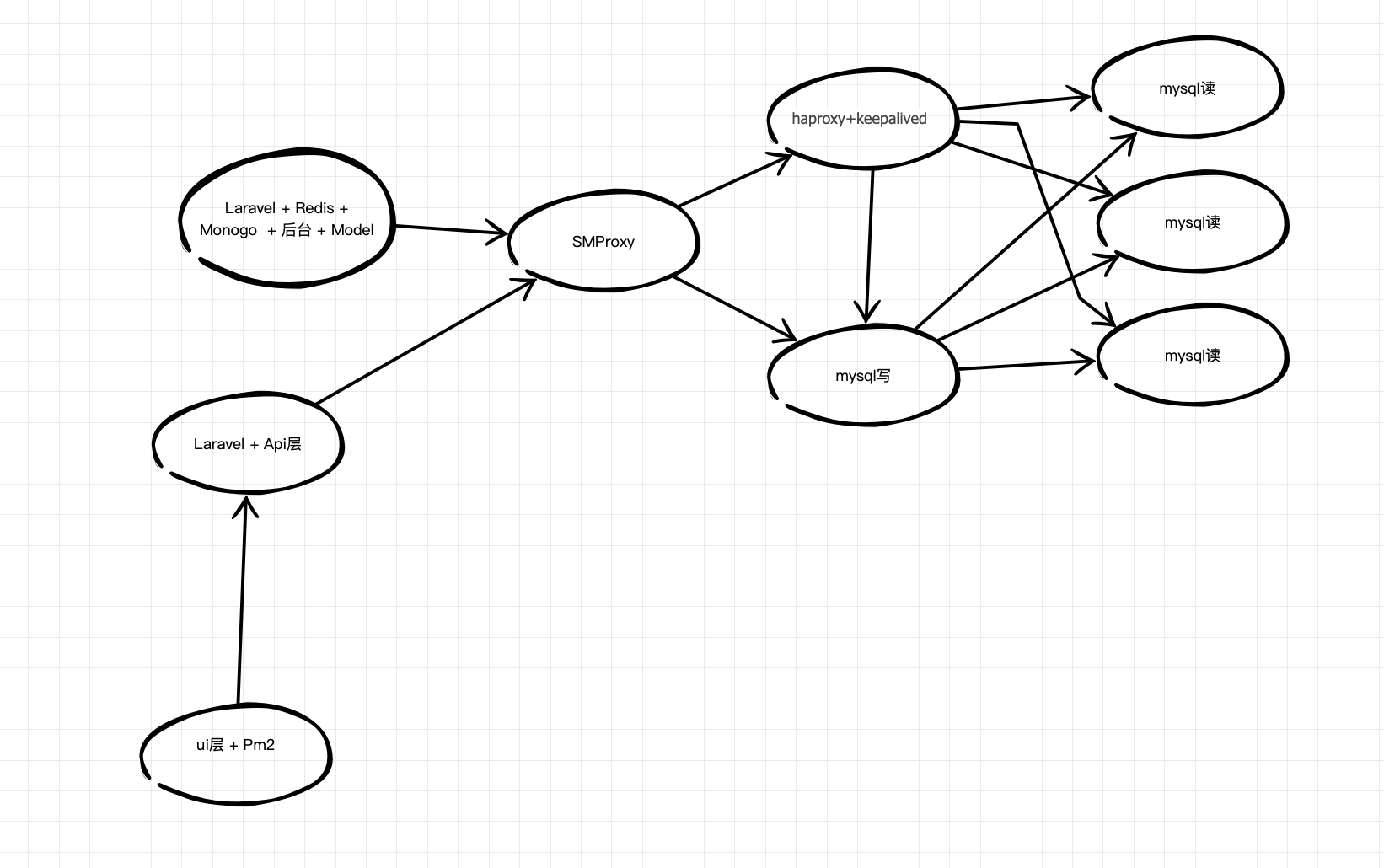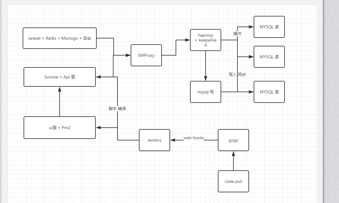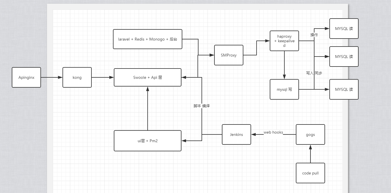 随着后面的访问量上来之后,mysql读的速度跟不上了,因为用的是laravel,laravel运行速度你们都懂,我就不多说了,那时候知道laravel+swoole可以通行,可是每次都要去服务器重启服务,而且那时候的swoole还停留在1.9的版本,估计坑也不少,所以为了保守,mysql和api层都做了负载均衡。 你就看到了如下情况。