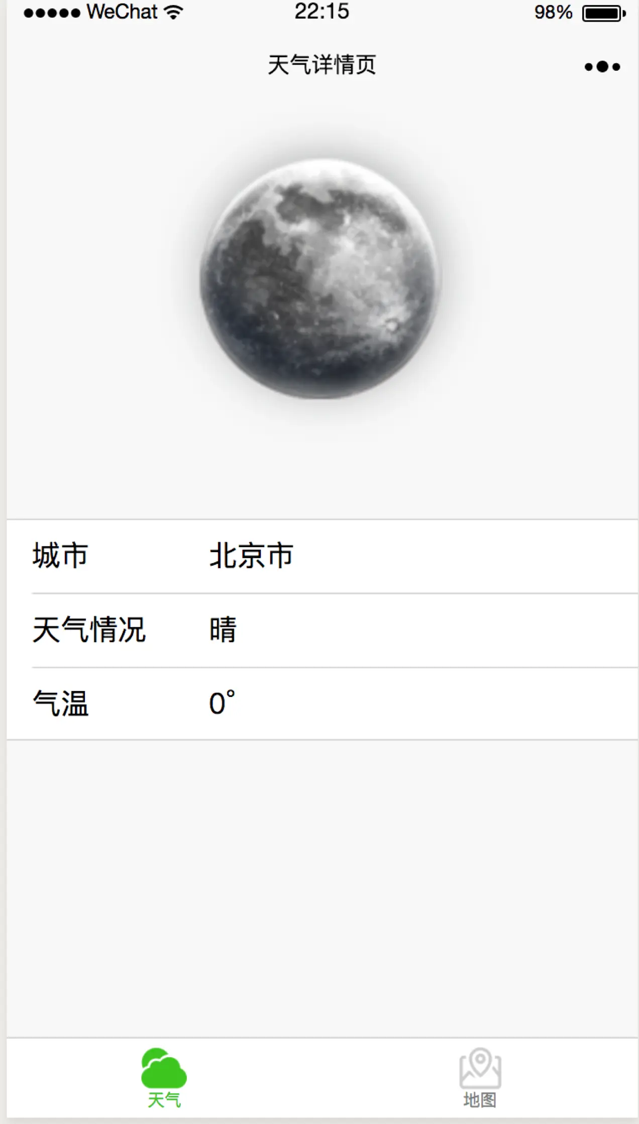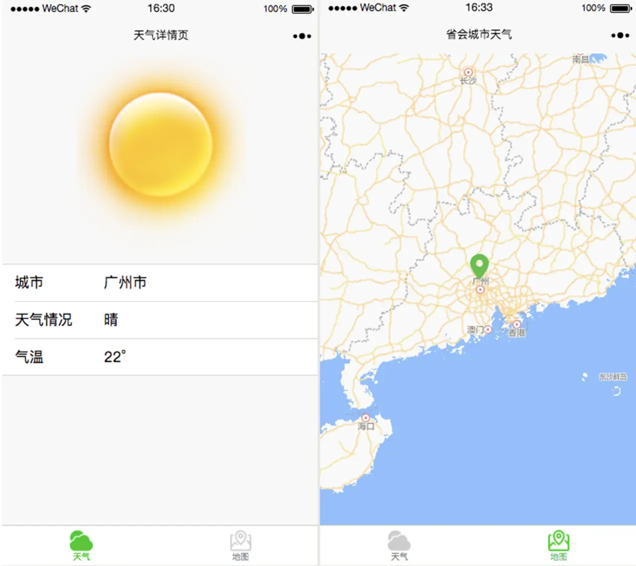 我们开发的小程序有两个页面:天气详情页面和地图页面,天气详情页面用于查看指定城市的天气状况,而地图页面用于选取城市。两个页面通过底栏 tab 来相互切换。