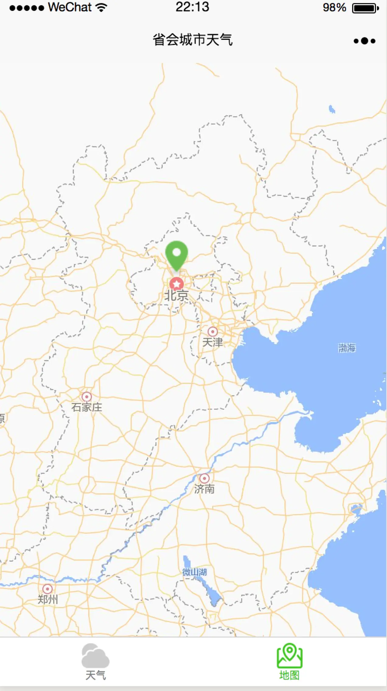 这个页面在地图上标注了全国34个省会城市,通过点击对应城市的 marker,可以查看该城市的天气情况。