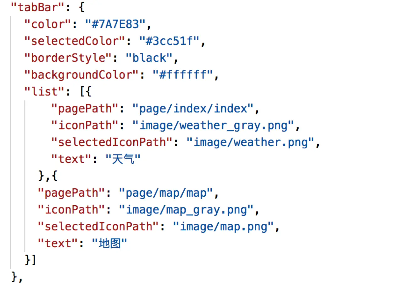 我们先配置小程序的底部 Tab,方便接下来我们切换页面,如下图,在 app.json 中加入如下代码。