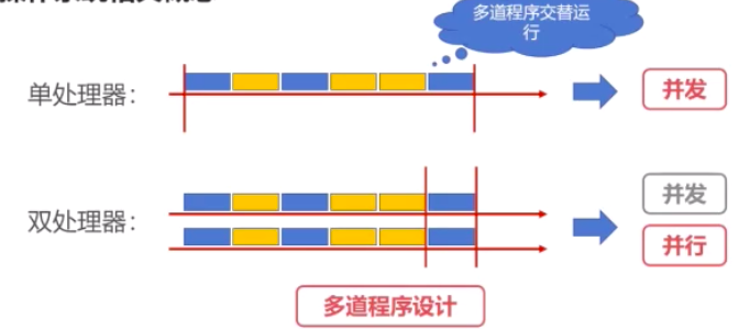 - 时分复用技术:资源在时间上进行复用,不同程序并发使用,多道程序分时使用计算机硬件资源,提高资源利用率